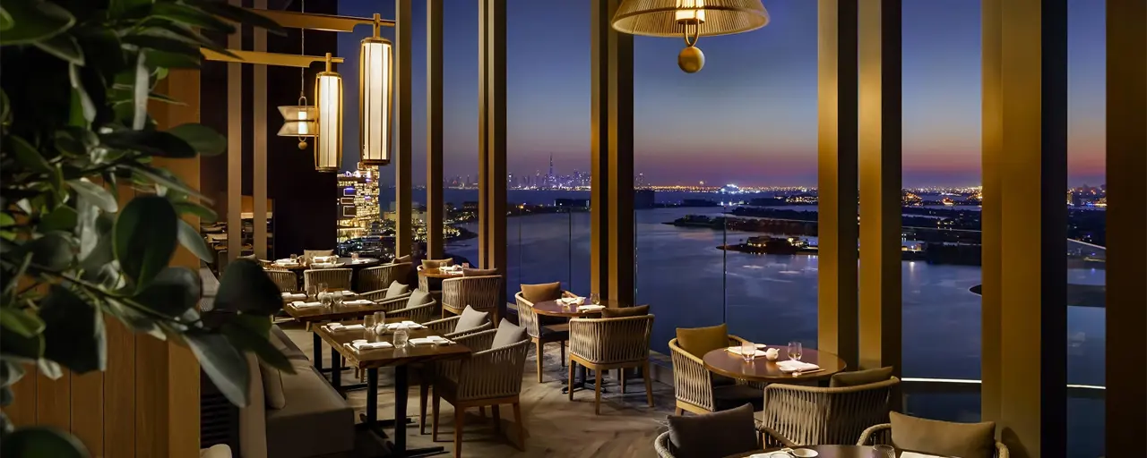 The new location of Nobu was designed to feature five dining areas, including an exclusive thirteen-seat sushi bar as well as an expansive terrace with a bar and lounge area, offering guests unforgettable views of The Palm and the Dubai skyline.